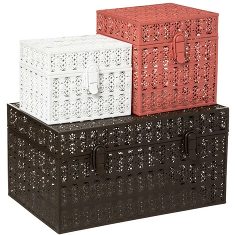 Atmosphera – Lot de 3 Boites de rangement en Métal Ajouré (-) Dimensions : S : L. 18 x l. 14 x H. 14,5 cm / M : L. 18 x l. 18 x H. 18 cm / L : L. 38 x l. 25 x H. 20 cm –