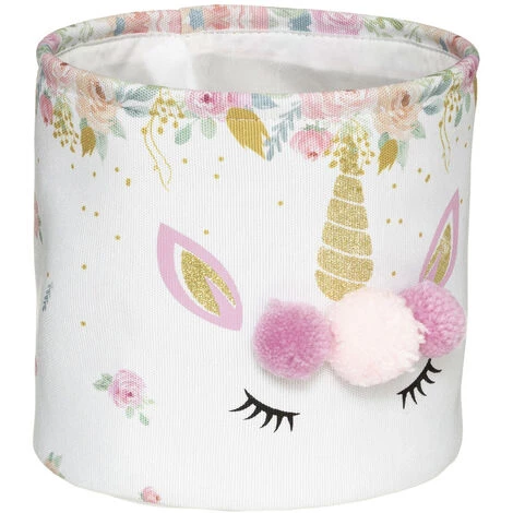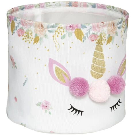 Atmosphera – Set de 2 Paniers de rangement Licorne en tissu avec pompons (-) Dimensions Produit : L. 30 x l. 30 x h. 26 cm