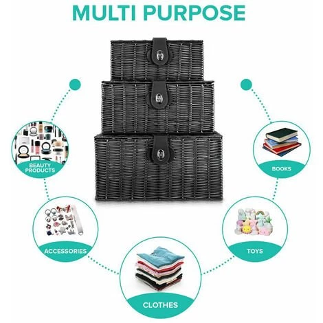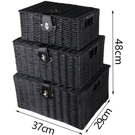 Dimensions: XL: 36 x 28 x 18,5 cm H, L: 31 x 18 x 15 cm H, M: 33 x 24 x 15,5 cm H, S: 28 x 20 x 12,5 cm H.Économisez de l’espace: parfait pour stocker des DVD, des CD, des livres, une télécommande, des boutons, une collation dans le salon. Produits de soins de la peau, chaussettes, émission de cartes dans la chambre. Articles de toilette, serviettes dans la salle de bain. Cela rendra votre maison organisée.Caractéristiques: Ces paniers de rangement avec couvercles peuvent protéger vos affaires de la poussière. Le style de conception pastorale rendra votre maison pleine de nature.Nettoyage facile: essuyez doucement avec un chiffon humide et rangez-le dans un endroit sec.couleur: noirpaquet: 3* panier de rangement