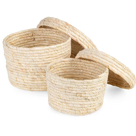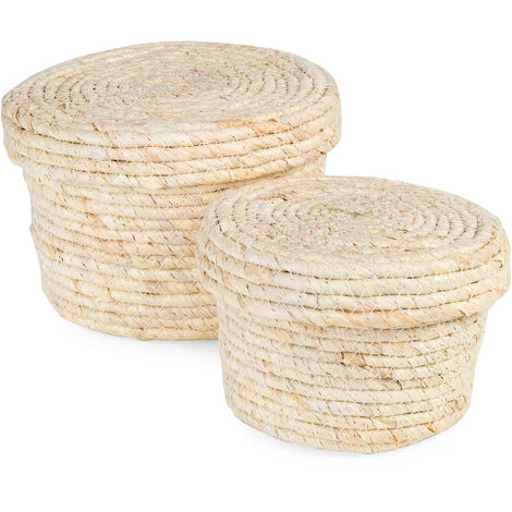 Réalisées en feuilles de maïs, tressées à la main, les boîtes Nata peuvent présenter de légères variations de forme ou de couleurs : celles-ci elles sont dues à la fibre naturelle utilisée. Ce n’est pas un défaut, au contraire, c’est ce qui fait la beauté et l’authenticité de ces boîtes de rangement, à la fois uniques et parfaitement coordonnées. Dimensions : Diamètre 21 X H.13 cm et Diamètre 17 X H.11 cm.