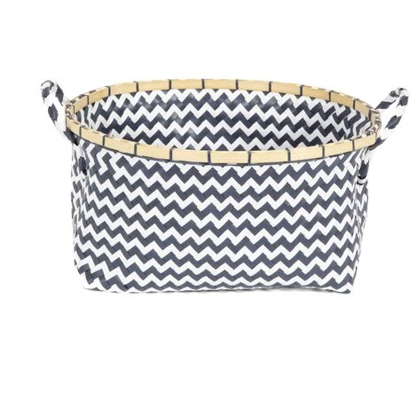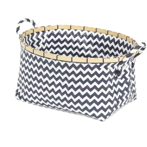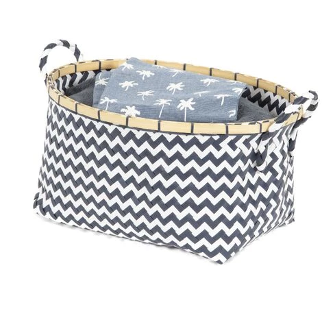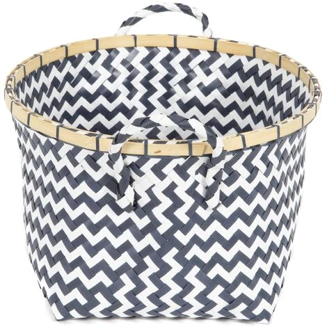 Ce grand panier de rangement est idéal pour organiser les jouets dans le salon ou la chambre des enfants. Il vous permettra également de regrouper coussins et plaids près du canapé ou de transporter le linge et les vêtements d’une pièce à l’autre. Les sangles plastique blanches et bleues dessinent un motif très graphique en zig-zags. La bordure est en bambou naturel.