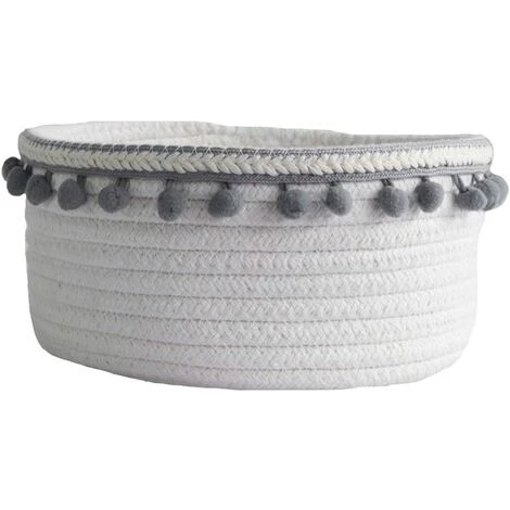 ELLE Panier En Corde De Coton Pour Bébé, Corbeille De Rangement Pliable Petit Boîte Organisateur Universel Pour Etagères, Placard, Bureau – Blanc/Pompons Gris