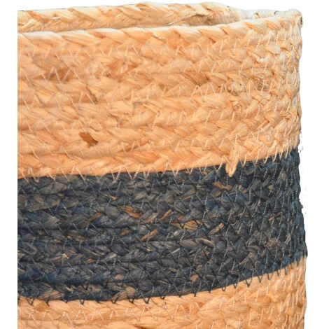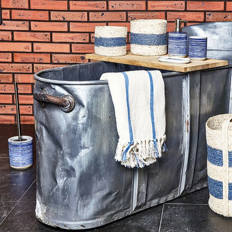Set de 2 paniers rond en fibre de papier tressé ornés d’une rayure bleue. 2 tailles différentes. Idéal au coeur de votre salle de bain afin de ranger vos accessoires. . Caractéristiques :. Dimensions : Pm 14 x 14 x 12 cm – Gm 16 x 16 x 15 cm. Coloris : naturel et bleu. Composition : fibre de papier. . Vendus par 2