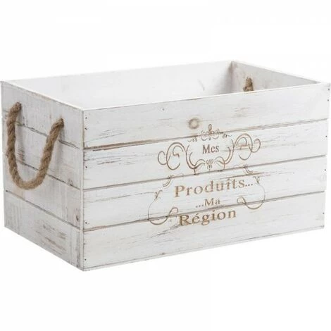 Caisse de rangement en bois teinté blanc avec poignées en corde.Matières : sapin et corde