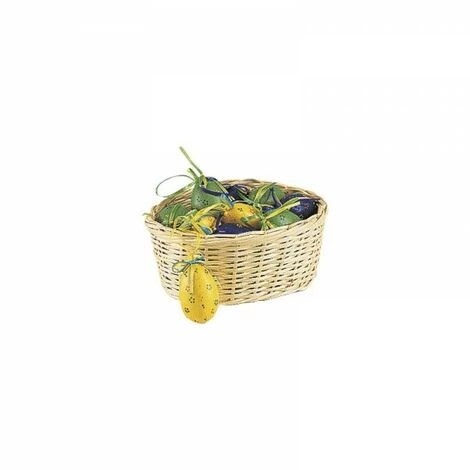 Corbeille en osier garnie de 18 oeufs en plastique de coloris assortis.Matière : éclisse