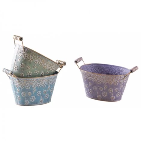 Corbeille ovale en métal, motif fleurs. Poignées en bois. 3 coloris assortis.Matière : métal patiné