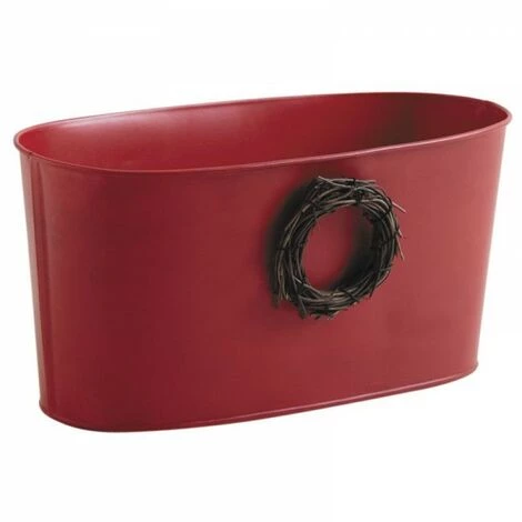 Corbeille ovale en métal laqué rouge avec couronne en rotin.Matières : métal laqué et rotin sauvage