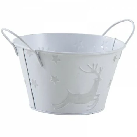 Corbeille ronde en métal laqué blanc, deux anses, motif cerf et étoiles.Matière : métal laqué