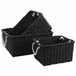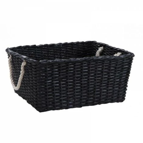 Corbeilles de rangement en papier recyclé noir, anses en corde.Matières : papier recyclé teinté et corde