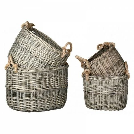 Série de 4 corbeilles de rangement en osier gris avec anses en corde.Matière : osier teinté
