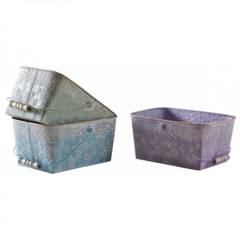 Panier en métal motif fleurs. Poignées en bois. 3 coloris assortis.Matière : métal patiné