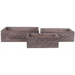 Kuatéh est une élégante sélection de pièces décoratives qui rassemble différents objets de design exclusif valables pour différents styles décoratifs. Des compléments tels que boîtes, paniers ou plateaux sont une solution de stockage pratique et polyvalente. Kuatéh vous propose plusieurs collections de boîtes et plateaux en bois de différentes tailles pour vos besoins de rangement (papiers, magazines, jouets, literie, ou bien là où votre imagination vous portera). Forgé ou vieilli, ou si vous préférez métallique, nos options de stockage ne renonce jamais à l’élégance. Les boîtes et les plateaux sont toujours une option fondamentale pour résoudre les problèmes de stockage. Rangez votre maison grâce à cet ensemble de plateaux en bois avec deux poignées pratiques pour laisser votre maison bien en ordre. Entretien et maintenance faciles. Passez simplement un chiffon doux et humide, tout en évitant tout contact avec des produits corrosifs. Dimensions: Grand (40 x 24 x 12 cm) Moyen (35 x 20 x 11 cm) Petit (29 x 16 x 10 cm) Matériaux: Bois avec finition rugueuse. Couleur: Bois Ensemble de trois boîtes en bois, parfaites pour la décoration offrant une solution polyvalente et fonctionnelle. Léger et facile à transporter. Très robuste. Aucun assemblage requis.