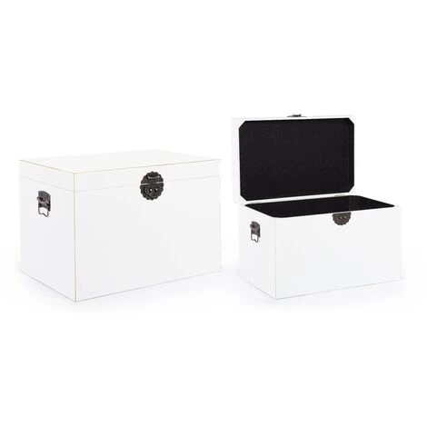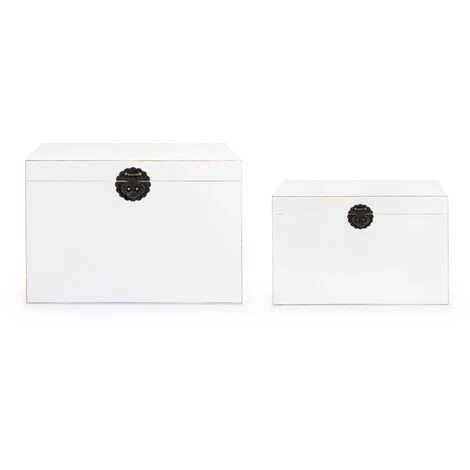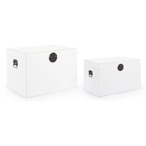 Ce lot de 2 coffres fera un vrai tabac chez vous. Vous pourrez y ranger vos trésors les plus précieux et le tout avec chic. Blancs, ils sauront vite s’adapter à votre décoration intérieure. Leurs fermoirs sont en fer et leur design est de toute beauté.Matière : Bois de sapin Couleur : BlancDimensions : – Petit coffre : L 52 x P 32 x H 34 cm- Grand coffre : L 60 x P 40 x H 42 cmFabrication : EspagneGarantie : 2 ansNous ne livrons pas en Corse.
