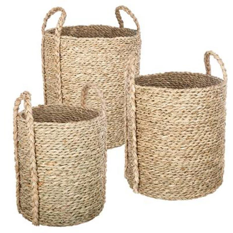 Optez pour ce lot de 3 paniers ronds de rangement en osier coloris naturel. Ensemble très utiles, ses anses vous permettront de les transporter en toute simplicité. Détail dimensions: taille S : L. 21 x l. 21 x H. 25 cmtaille M : L. 30 x l. 27 x H. 30 cm. taille L : L. 33 x l. 32 x H. 35 cm. Poids : 1,5 kg. Matière: osier. Couleur: naturel.