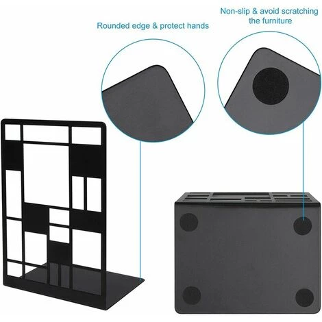 Sécurité : il y a 4 coussinets en mousse antidérapants au bas de chaque serre-livre noir, ce qui est plus stable. La conception d’impression de livres plus conviviale peut prévenir efficacement les rayures. Par exemple, les serre-livres en métal en forme de L ont des bords arrondis et lisses. Protégez-vous efficacement, vous et vos enfants.