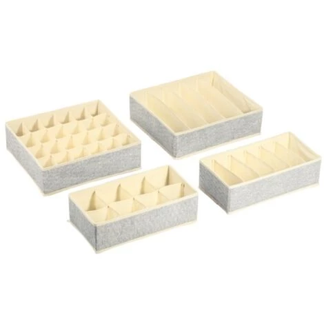 Lot de 4 Boîtes Tiroir de rangement micrcoaéré et respirant avec compartiments Gris de la marque MSV. Placez les boîtes là où vous en avez besoin, vos affaires seront en ordre et à portée de main. Utilisation multiple: Des petits objets du quotidien peuvent être stockés dans ces bacs. Idéale dans la salle de bain, cuisine, chambre et autres pièces de la maison. Respirant et micro aéré, il évite aux bactéries de s’installer! Design neutre et élégant. Pliables pour un rangement peu encombrant.