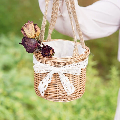 Décoration de panier à fleurs : vous pouvez mettre vos fleurs préférées, fleurs séchées, fleurs artificielles dans le panier tissé, et profiter du plaisir du bricolage. Le panier est enveloppé de dentelle blanche et attaché avec un nœud. Peu importe où il est placé, il peut ajouter une sensation de fraîcheur et de nature à la pièce.