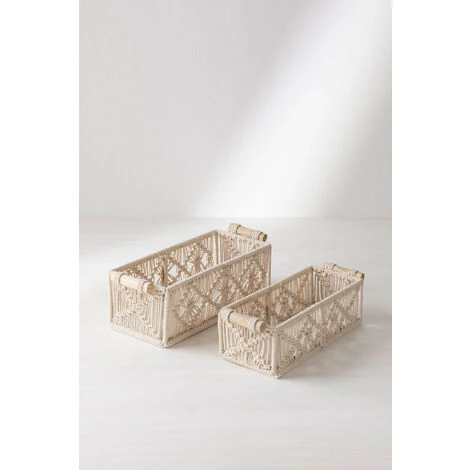 Le panier de rangement Farid est l’élément parfait pour garder les pièces de votre maison bien rangées et propres tout en complétant la décoration avec des accessoires de rangement. Son design rectangulaire comprend deux poignées en bois de bambou avec lesquelles vous pourrez facilement le transporter dans la pièce de votre choix. Il est fait de coton de première qualité, 100% écologique et durable. Vous pourrez les utiliser dans la salle de bain, dans votre chambre pour ranger vos affaires, et même dans l’entrée pour ne pas oublier vos objets du quotidien. Combinez-le avec des accessoires faits de matériaux et de couleurs similaires et créez un style naturel avec une atmosphère joyeuse et accueillante. Pour le nettoyage, nous vous conseillons d’utiliser un chiffon humide et d’éviter l’utilisation de produits chimiques. Dimensions (Hauteur x Largeur x Profondeur): 8,5 – 10,3 cm x 28 – 29,8 cm x 11 – 13 cm IMPORTANT : Le service standard porte-à-porte ne comprend pas la livraison et la collecte des marchandises au domicile du client, qui sont à la charge de ce dernier. Il est possible que le livreur aide volontairement à la livraison de la marchandise (ceci est totalement volontaire pour le livreur et la société de transport et ne relève pas de la responsabilité de Sklum).L’assemblage n’est pas non plus inclus.