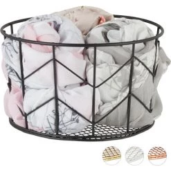 Ce panier en métal est un vrai panier à tout faire et offre un espace de rangement pour vos accessoires. La corbeille ronde de rangement se fonde sans problème dans toutes les pièces et toutes les étagères. Rangez vos cosmétiques, vêtements tels que sous-vêtements, chaussettes ou serviettes sans prendre trop de place. Peu également servir de décoration ou de corbeille à papier sur un bureau. La forme géométrique est remarquable et donne un charme vintage à ce panier en fil de fer.