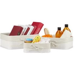 Avec ce lot de 3 corbeilles, rangez et organisez votre intérieur avec style et méthode. Le design et les différentes dimensions de ces paniers de rangement vous permettent de les utiliser dans toute la maison : dans la salle de bain pour ranger vos ustensiles de maquillage, sur une étagère dans le salon ou dans la chambre de votre enfant pour conserver les jeux en bon ordre. Lorsqu’ils ne sont pas utilisés, les organiseurs peuvent être empilés les uns dans les autres pour économiser de la place.