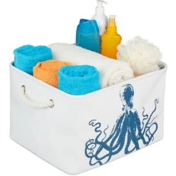 Ce panierd’étagère offre un espace de rangement et peut servir pour diversesutilisations. La boîte de rangement est idéale pour ranger les ustensiles desalle de bains, les jouets, le matériel de bricolage, les livres et autresobjets. Le design marin avec ses rayures bleues et blanches, son motif depieuvre et ses poignées en corde s’adapte parfaitement aux intérieurs de stylemaison de plage et attire le regard dans toutes les pièces. Lorsqu’il n’est pasutilisé, le panier décoratif peut simplement être replié et rangé pour gagnerde la place.