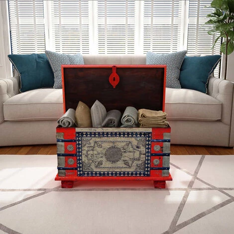 Ce coffre de rangement au style antique sera un ajout unique à votre pièce. Sa construction en bois massif le rend stable et adapté pour y poser des verres, des paniers de fruits ou des objets décoratifs. En déverrouillant le coffre (cadenas non inclut dans la livraison), vous pouvez facilement y ranger un grand nombre de choses. Il peut également être utilisé comme coffre décoratif ou comme table basse. Fait en bois de manguier, ce coffre est solide, durable et magnifique. La finition antique et les motifs décoratifs donnent à chaque mobilier sa propre histoire et un aspect unique. Ce coffre indien est entièrement fait à la main. Chaque étape du processus est effectuée avec le plus grand soin, qu’il s’agisse du polissage, de la peinture ou du cirage.