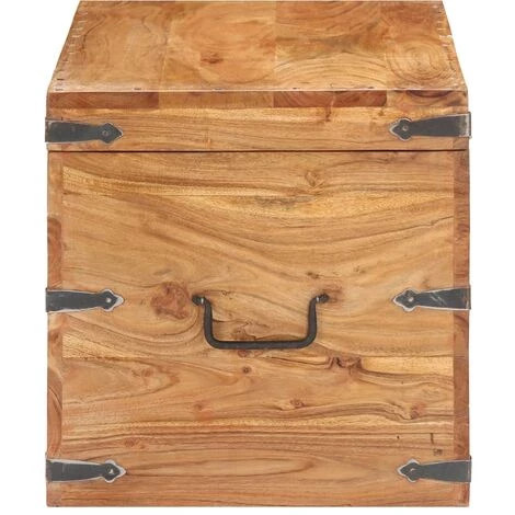 Ce coffre est en bois d’acacia massif, ce qui le rend stable et durable. Il a un loquet sur le devant et deux poignées sur le côté pour soulever le coffre. Cette boîte de rangement, avec un dessus plat stable, peut également être utilisée comme banc d’entrée. Le savoir-faire artisanal et les belles veines du bois rendent chaque meuble unique et légèrement différent l’un de l’autre.