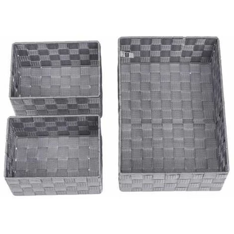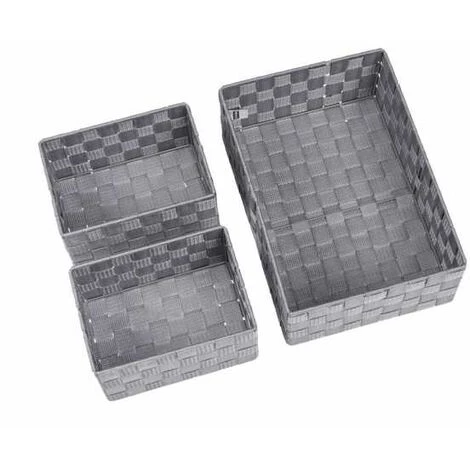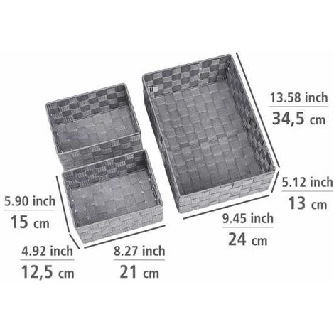 - Contenu de la livraison : Corbeille de bain grise Adria, kit de 3 paniers de rangement composé de 2 corbeilles S – dimensions extérieures : (l x h x p) : 21 x 12,5 x 15 cm, dimensions intérieures (l x h x p) : 20,5 x 12 x 14 cm, contenance 3,45 l et 1 corbeille L – dimensions extérieures (l x h x p) : 34,5 x 13 x 24 cm, dimensions intérieures (l x h x p) : 34 x 13 x 23,5 cm, contenance : 10,39 l. Fabriqué à base d’un tissage de fibres synthétiques (polypropylène).