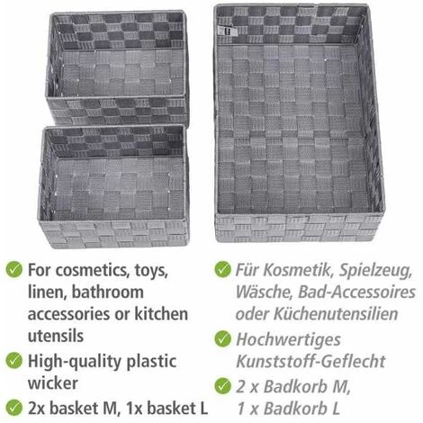 - Organisateur décoratif pour un équipement uniforme : Le kit d’accessoires en 3 pièces pour salles de bain Adria pour le rangement et l’organisation d’accessoires de bain est la bonne solution pour ranger vos petites serviettes et ustensiles de bain ! Les corbeilles pratiques vous facilitent le quotidien et apportent une ambiance harmonieuse et sereine à votre étagère dans la salle de bain et embellissent le visuel global en un clin d’œil, également dans les WC visiteurs.