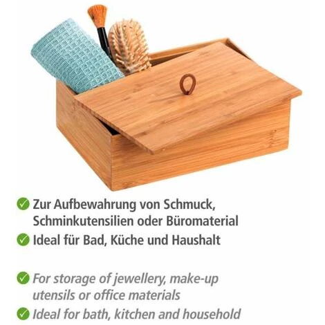 Avec les boîtes de rangement et les organisateurs de haute qualité de la série Terra, vous conférez à votre salle de bain une ambiance chaleureuse et naturelle. Ils sont le compagnon idéal pour placer des notes précises dans votre salle de bain. Ainsi, les belles boîtes de rangement deviendront à coup sûr votre point de mire intérieur personnel. La boîte de rangement avec couvercle Terra L n’est pas seulement décorative, elle tient également à portée de main tous les ustensiles importants pour le bien-être quotidien dans la salle de bain et dans tout le foyer. Il est parfait pour le rangement des ustensiles de maquillage, des bijoux, des matériels de bureau, etc. Grâce au couvercle astucieux, le contenu du panier est toujours à l’abri des regards indiscrets, de la poussière et de l’humidité ! Ainsi, tous les ustensiles sont rangés discrètement et fiablement. La belle boîte de rangement est fabriquée en bambou de qualité supérieure, qui est à la fois dur et résistant. Le matériau offre également des avantages évidents d’un point de vue écologique : le bambou est une matière première rapidement renouvelable et absolument tendance. Particulièrement pratique : Toutes les tablettes et boîtes de rangement de la série Terra se combinent à merveille les unes avec les autres.