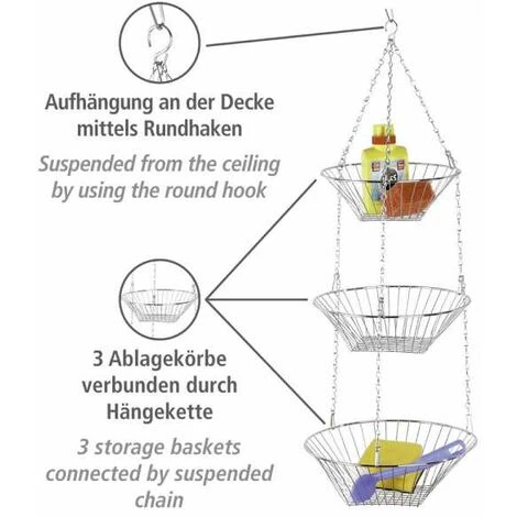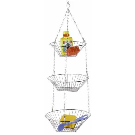 Cette étagère de cuisine est une aide utile dans la maison. Les trois corbeilles de rangement reliées par une chaîne offrent un grand espace pour accueillir fruits, légumes ou ustensiles de cuisine. Grâce au crochet rond pratique, l’étagère peut être suspendue simplement et dans un encombrement réduit au plafond. Le métal chromé permet à cette étagère de cuisine de faire bonne impression.Ø: 28 cm x H: 10 cm
