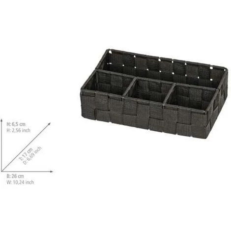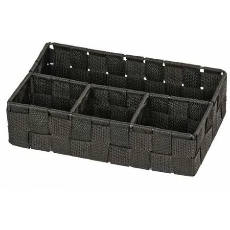 L’organiseur de salle de bain Adria Quadro noir met fin aux problèmes d’ordre. La petite aide en tresse plastique haut de gamme offre dans quatre compartiments suffisamment de place pour les barrettes, les brosses ou bien d’autres accessoires de salle de bain. Cette petite aide s’avère ainsi être un must dans chaque salle de bain. Le coloris noir élégant fait un effet noble et se marie habilement avec tous les entourages.l: 26 cm x H: 6,5 cm x P: 17 cm