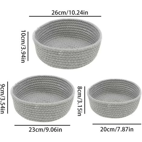 3 pièces : il y a 3 bacs de rangement en corde dans chaque colis, et ils ont une taille de grand : 26 x 10 cm/10 x 4 pouces, moyen : 23 x 9 cm/9 x 3,5 pouces, petit : 20 x 8 cm/7,8 x 3 pouces.