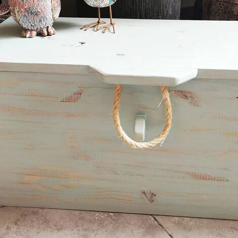 Coffre en bois de pin Fait main, lasuré vert Bois de pin Poignées en bois et corde Dim : 32 x 34 x 79 cm (dimensions prises avec les poignets) Fabriqué en France