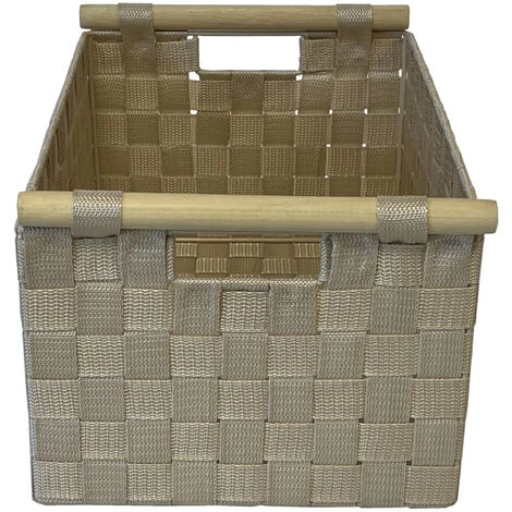 Panière dĂ©co en Polypropylène tressĂ© Polypropylène – Bois – Structure mĂ©tal Dimensions : Hauteur 18 cm (hors anse) – Largeur 25 cm – Profondeur 35 cm